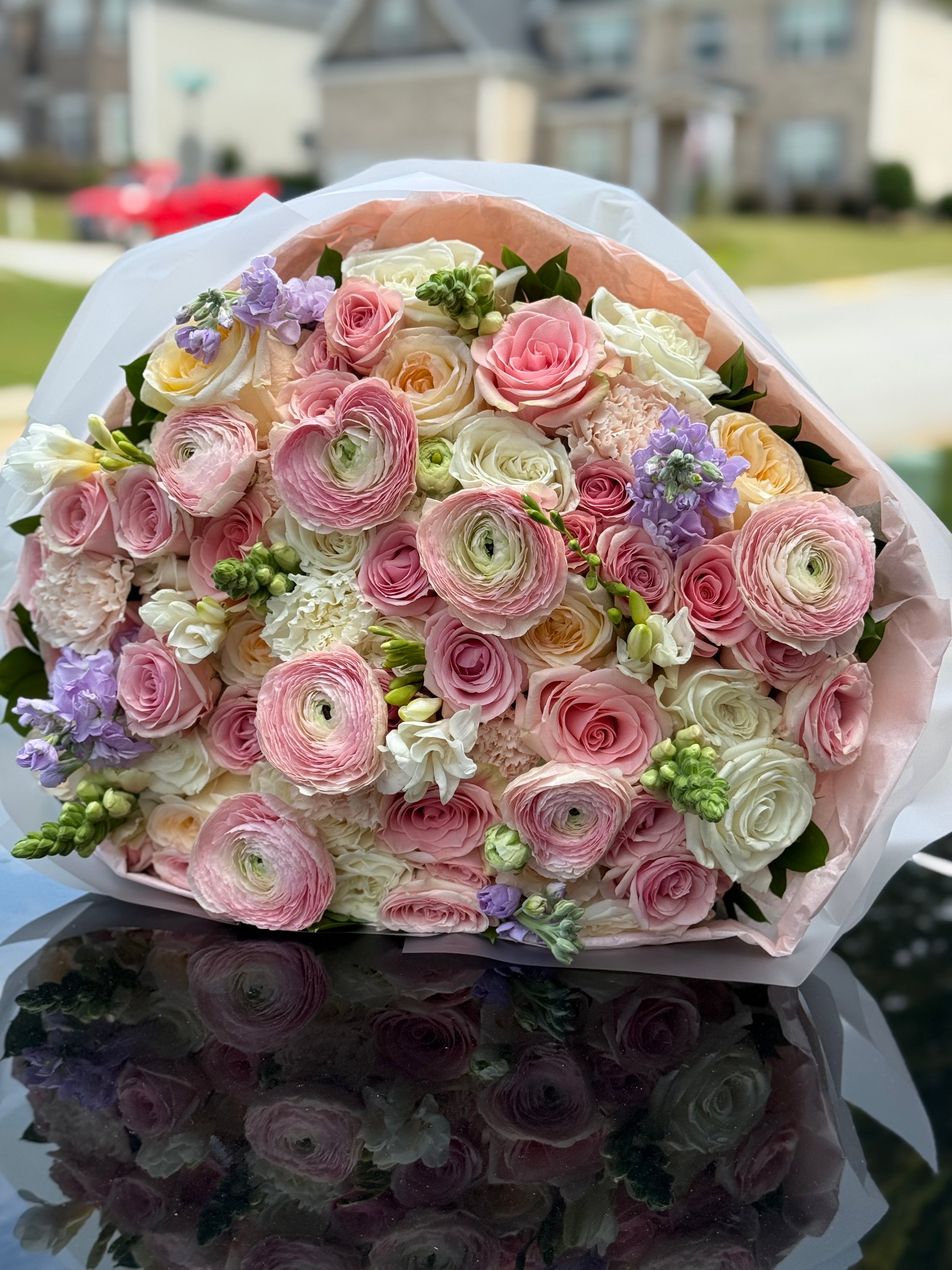 This elegant bouquet features a refined blend of ranunculus, roses, stock, and spray roses, carefully arranged to create a harmonious and visually captivating display. Perfect for those who appreciate timeless beauty, this mix offers delicate textures and rich colors that elevate any setting with subtle sophistication. Ideal for gifting or enhancing your space with natural charm.
